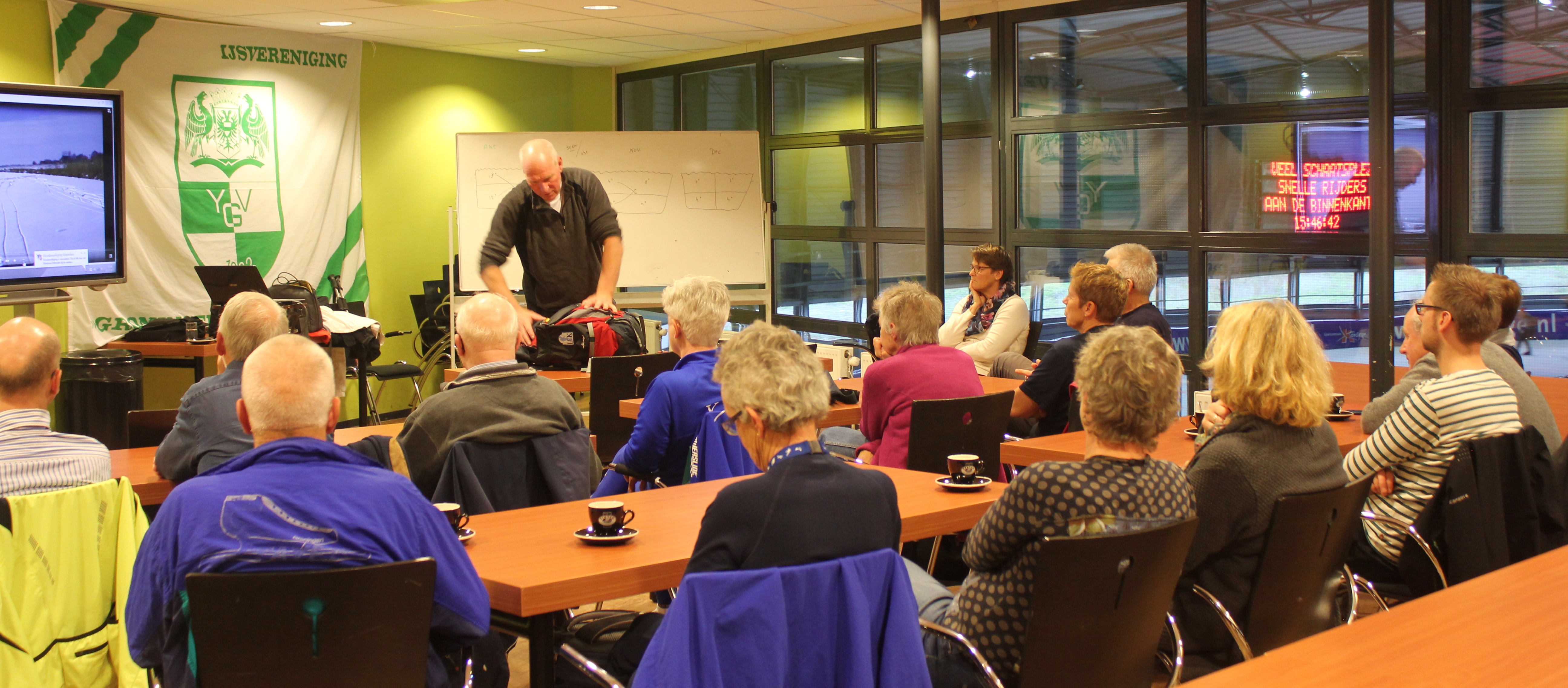 Het was een mooie lezing! Schaatsen in Zweden is een avontuur, een belevenis. Met de nodige voorzorg, veiligheid voor alles, is het genieten van schaatsen op een groot meer. Cor Faber vertelde boeiend aan de hand van foto’s en films en toonde spullen die nodig zijn voor Zweedse tochten. We zagen een redding van een schaatser uit een wak, goed afgelopen door gebruik van life-line en ijspriemen. Altijd op weg met minimaal 3 schaatsers over zwarte ijsvlakten, soms met scheuren en schotsen. Een gids altijd voorop!.