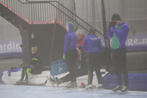 Ondanks de klamme omstandigheden, die niet onder doen voor een mistige dag op natuurijs, worden er best goede tijden gereden, zelfs PR’s. Er zijn mooie tijden op de 500 meter mannen,  onder de 40 sec. zelfs 2 maal, 39,82  en 39,84.