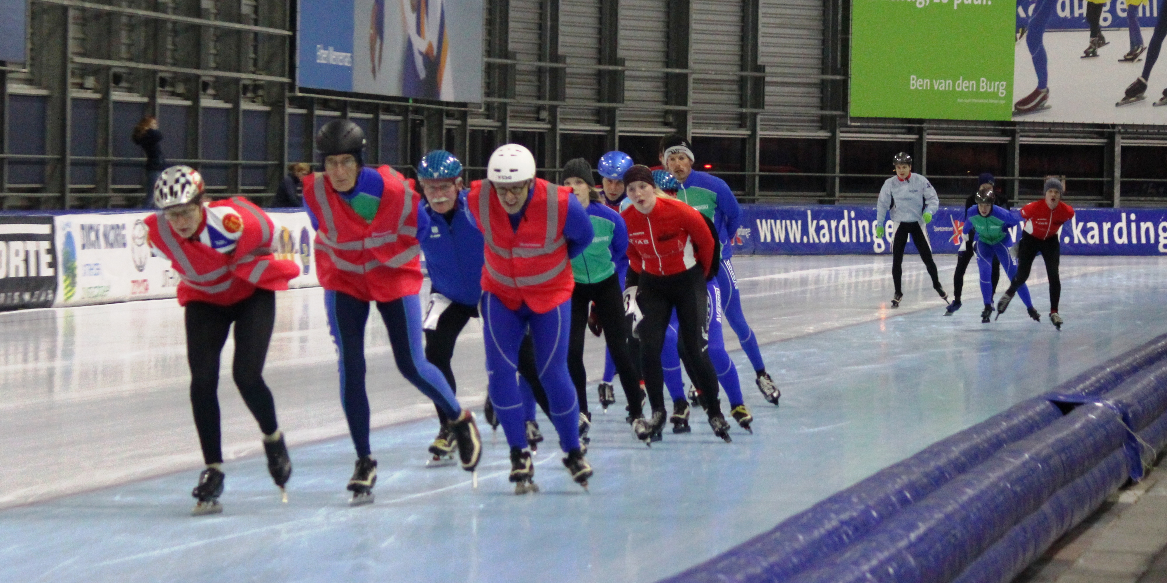 Vervolgens een 12 tal recreanten groepC op het ijs voor hun 30 ronden. Zij starten rustig en vormen langere tijd een mooi lint op de blauwe baan achter de voorrijders. Uiteindelijk sprinten een 8tal rijders om de winst.