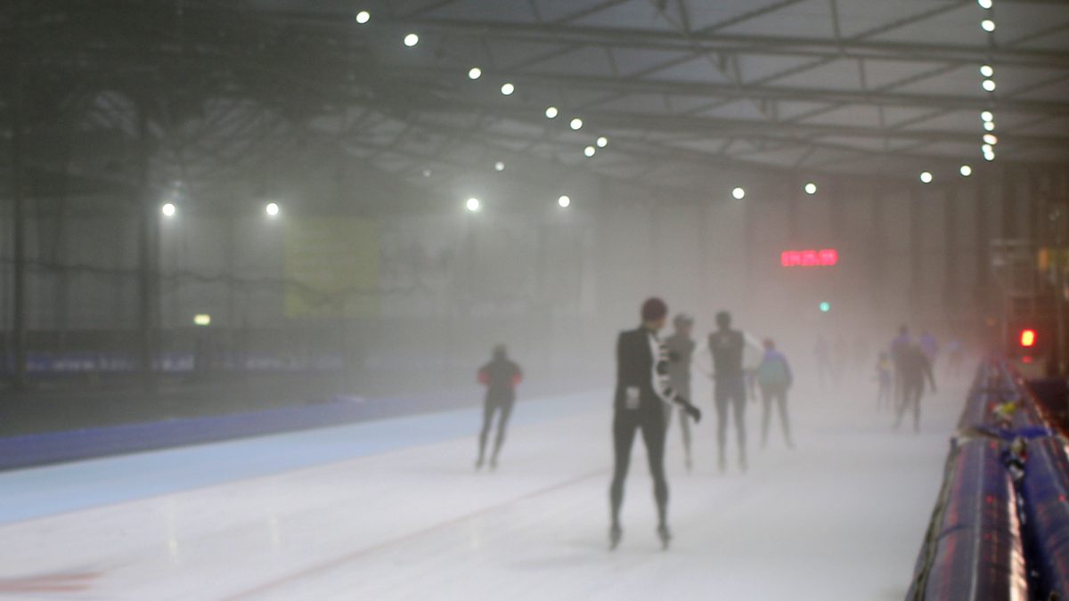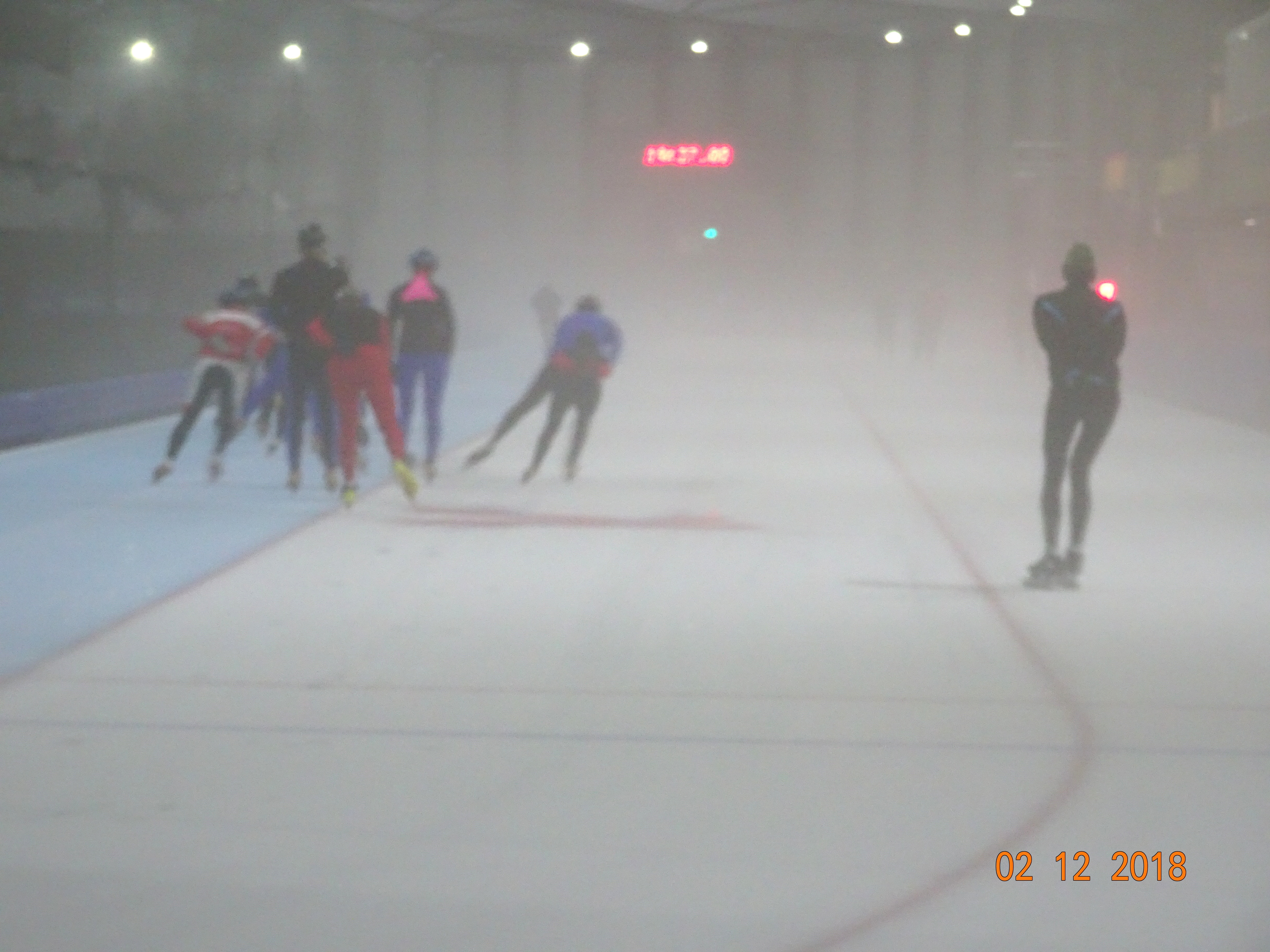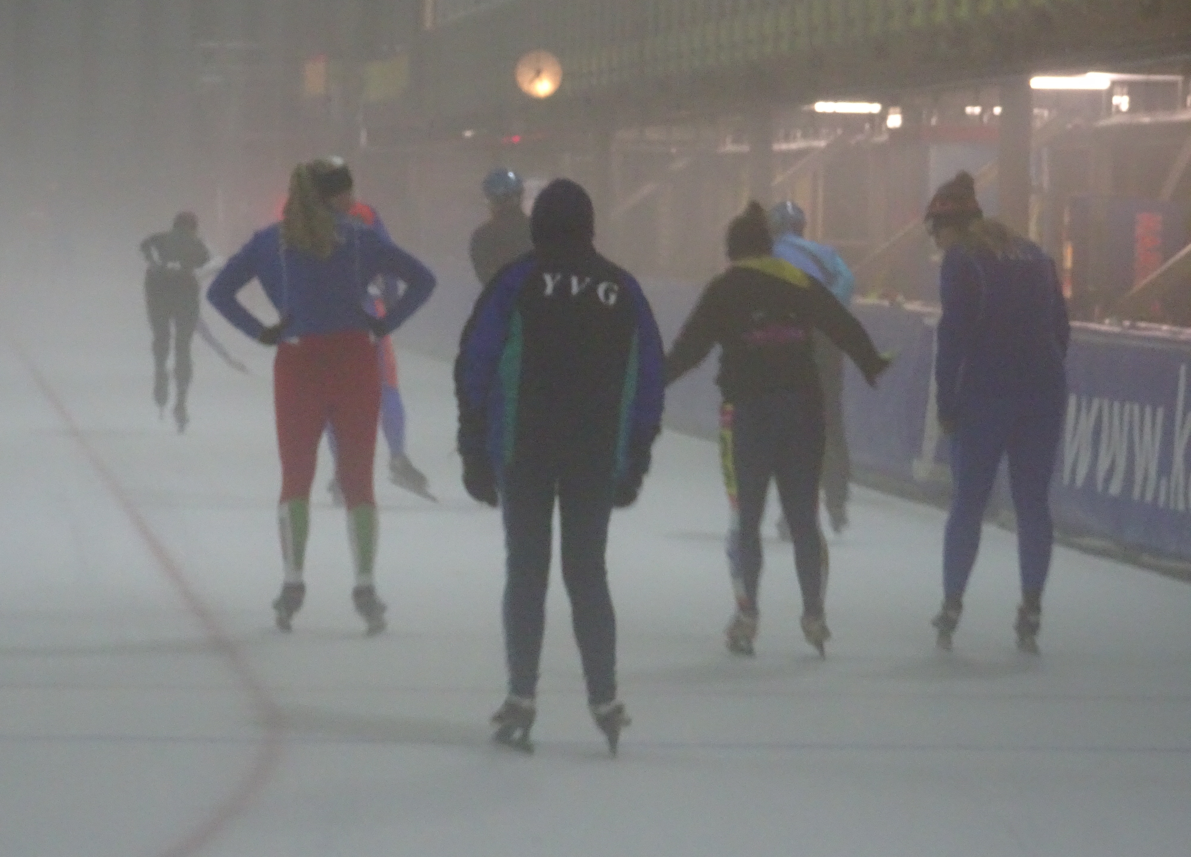 Zondag op ongewoon tijdstip staan tientallen YVGers te wachten langs de ijsbaan. Tjas rond haar studentenwedstrijden af om 19 uur. Zamboni snelt rond, maar heeft kwartier nodig om het sterk aangeslagen ijs te laten spiegelen. Om 19.15 uur glijdende yvg-sportievelingen weg in de mist. Om ronde na ronde ook weer op te duiken. Toch speciaal om mee te maken, dit illustere effect.