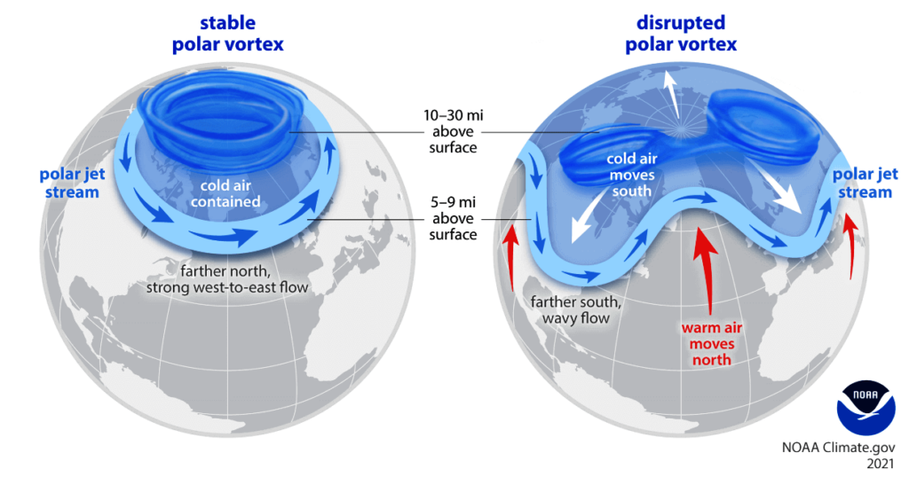 Boven de noordpool draait normaal vooral in de winter een grote ton met koude lucht op deze hoogte rond. Deze wordt door de straalstroom die van west naar oost draait stabiel gehouden. Soms wordt die ton instabiel omdat de straalstroom ook minder strak rond waait. Dan kan deze ton aan kou als een plumpudding in elkaar zakken. Hierdoor komt de kou omlaag naar onze atmosfeer en wordt de gebruikelijke westenwind geremd. Soms gaat deze zelfs uit het oosten waaien.