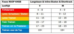 YVG gebruikt het meerjaren opleidingsplan van de KNSB als handvat voor het trainen van de jeugd. De KNSB onderscheid meerdere fasen die kinderen op de schaats doormaken. Van het begin, het FUNdament tot trainen voor de Top (zie schema hiernaast). Voor YVG richten wij ons met name op het FUNdament, Leren schaatsen en Leren trainen. In dit geval de bovenste drie fasen. Goed om te vermelden is dat er een range van -2/+2 jaar in het schema kan voorkomen afhankelijk van de ontwikkeling van ieder kind.