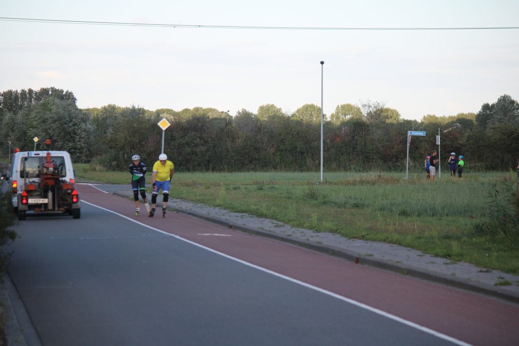 25/09/2019Sinds de sluiting van skeelerbaan Ten Boer wordt er noodgedwongen 2x per week getraind op het asfalt van Westpoort. Industrieterrein aan de A7 bij Hoogkerk. Een 20tal YVG leden in groepjes jeugd en senioren met trainers her en der op deze geïmproviseerde skeelerbaan. In de verte raast het verkeer op de A7 voorbij. De inline skaters draaien fanatiek hun rondjes of zijn heel serieus met oefeningen bezig, vooral de jeugd. Op een rustiger plekje. Het is lekker ‘skeeler’weer. Niet te warm, beetje wind, ondergaande zon. Ongemakkelijk en soms minder veilig door het openbare karakter van de gebruikte wegen. Er rijdt gewoon verkeer, zelfs grote vrachtwagens. Gelukkig respecteren de chauffeurs onze skeeleraars. Helaas geen enkel vorm van accommodatie. Best een probleem bij valpartijen, voor de wachtende ouders, of hoge nood. Maar er kan met deze oplossing wel getraind worden!