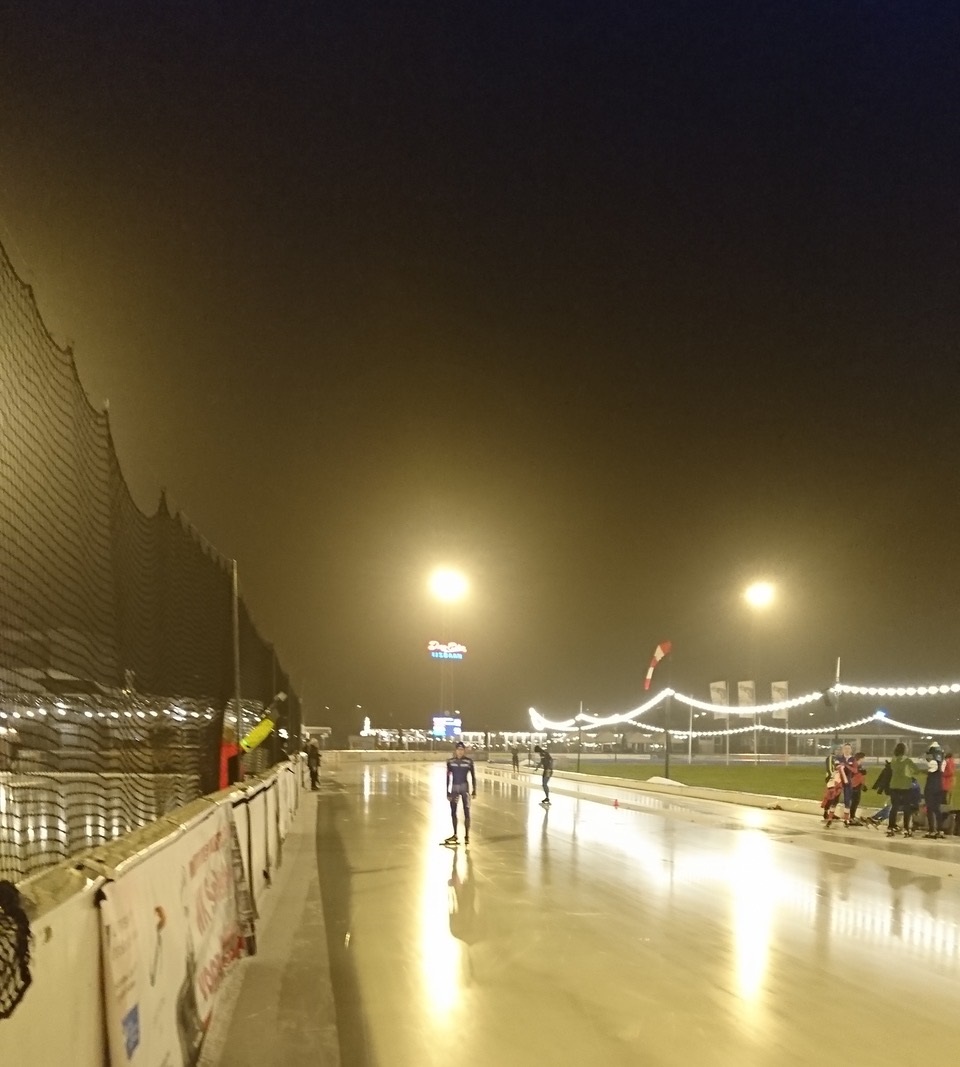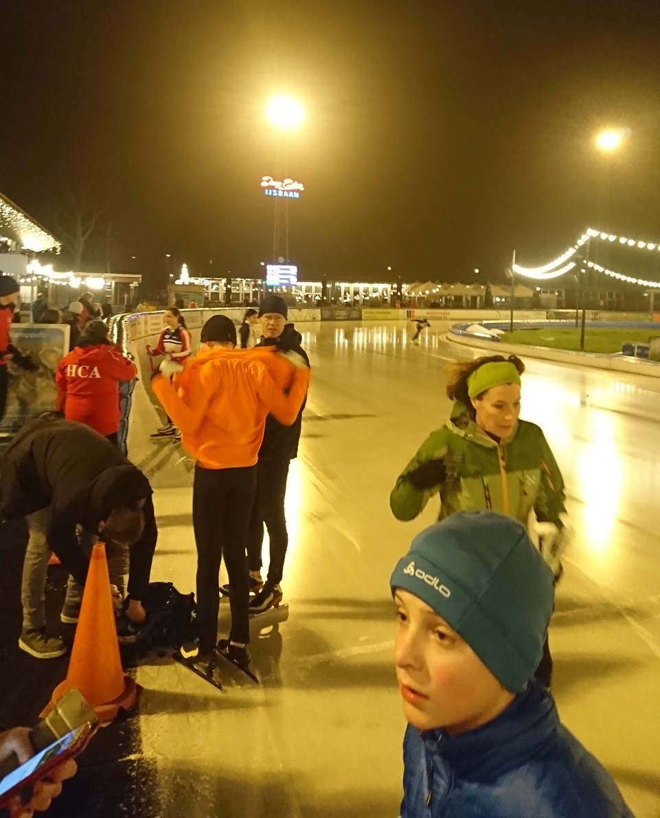 Het was al weer heel wat jaren geleden dat ik op de Jaap Eden (de oudste kunstijsbaan van Nederland) was geweest, dus toen er een coach gezocht werd om een groepje schaatsers van YVG te begeleiden dacht ik leuk daar ga ik heen. De Jaap Eden ijsbaan is één van de weinige banen die nog volledig open is realiseerde ik mij later, dus ook kans op regen en wind. Hierdoor ook iets minder geliefd voor de rijders op jacht naar een pr, maar voor de liefhebber een baan waar je eens moet rijden. De wedstrijd begon om 19:45 uur, het was praktisch windstil maar dat was voor ons binnenrijders toch nog wel even wennen schaatsen met tegenwind op de kruising. Ondanks dat wisten Silke en Sil een pr te rijden op de 1000m, Sil wist er zelfs nog een heuse eindsprint uit te persen. De andere rijders bleven ver van hun pr, maar dat was ingecalculeerd dus niemand was echt teleurgesteld.
